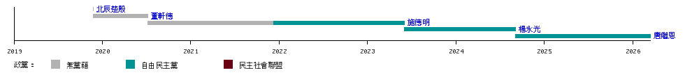 from:01/06/2023 till:03/09/2024 color:自由民主黨 text:"[[楊永光]]" fontsize:8 | |||