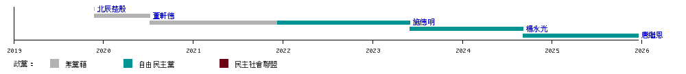 from:01/06/2023 till:03/09/2024 color:自由民主黨 text:"[[楊永光]]" fontsize:8 | |||